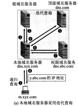 本地域名服务器向根域名服务器的查询是迭代查询,即当根域名服务器无法完成解析时,就把下一步应该查询的域名服务器告诉本地域名服务器。