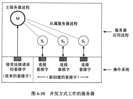 主服务器进程 M 用来不停地接受新的连接请求,M 原本就有一个套接字,但是每收到一个新的请求就为它创建一个新的套接字,并把这个新的套接字的标识符返回给客户。然后它会创建一个新的从属服务器进程使用刚才创建的新的套接字来和客户建立连接。而主服务器进程 M 则使用原来的套接字继续接受下一个连接请求。